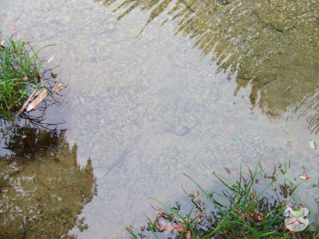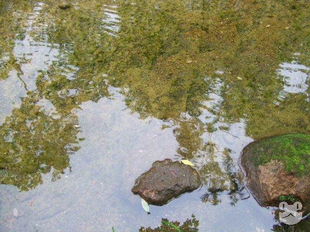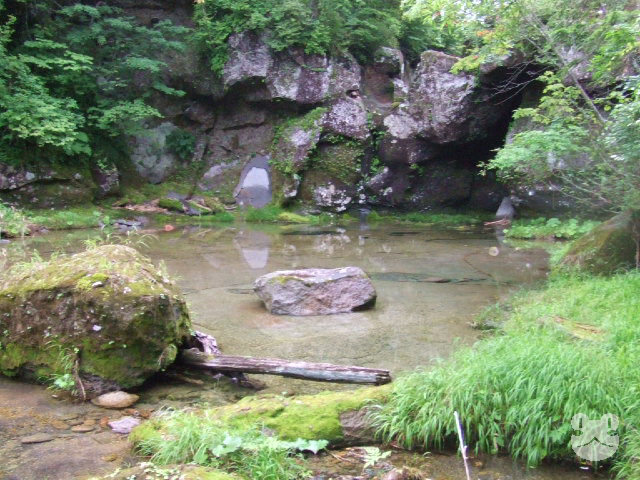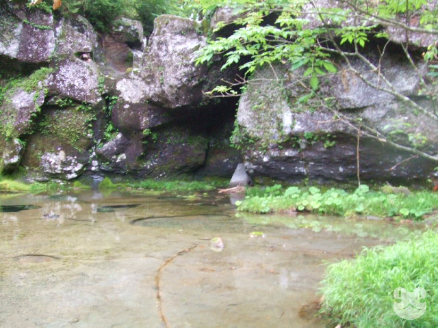 左側の不自然にツートンカラーになっている部位も気になるが、何らかの理由で穿ったものを埋めたとかだろうか。水が染みて変色しているのかもしれない。一枚岩の水底が大理石のような光沢になっている。ところどころに穴が開いているが、これは岩から小さな滝となって流れ落ちていた時の滝壺なのだという。その小滝は今でも見られるといわれていたが、訪問当時は見られなかった。