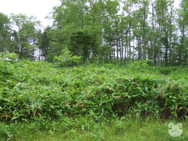 道からの景色。背丈以上のイタドリが視界を遮る。延々と続くダートはほぼ平地だが、幅は1台分しかない。ところどころに退避スペースがある。