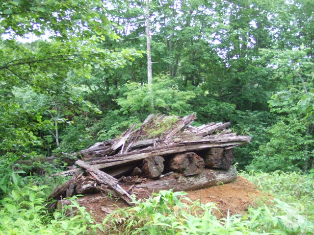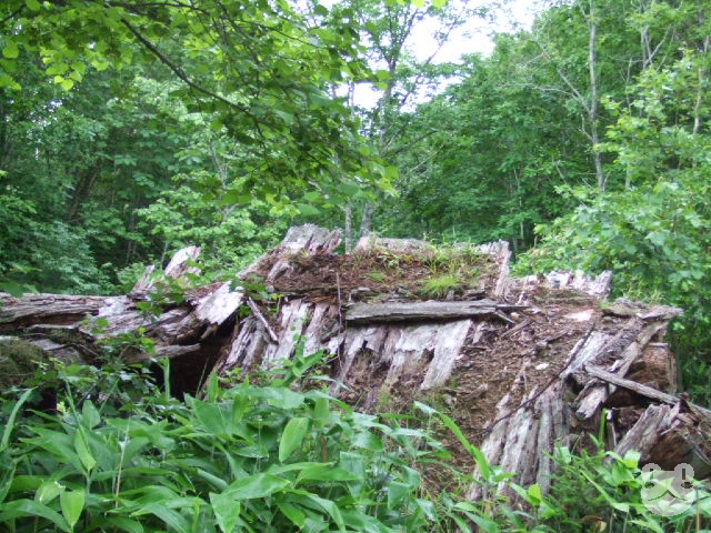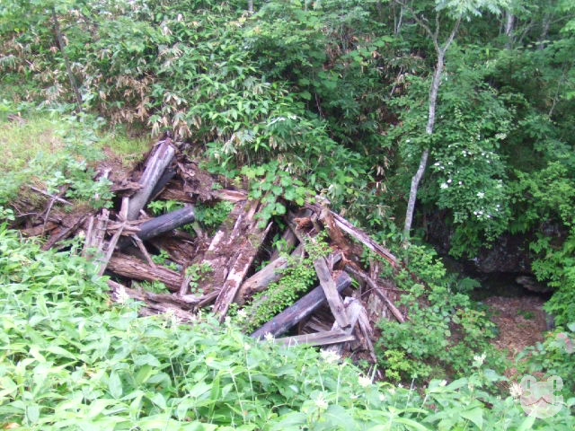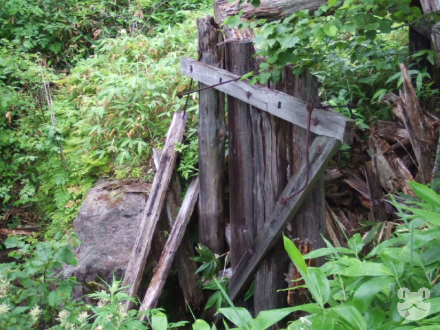 道の脇に、朽ちた木材が堆積されていた。橋として使われていたものだろうか。