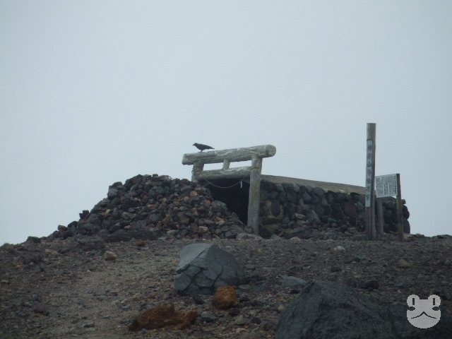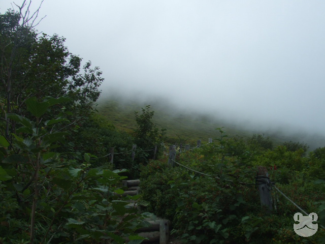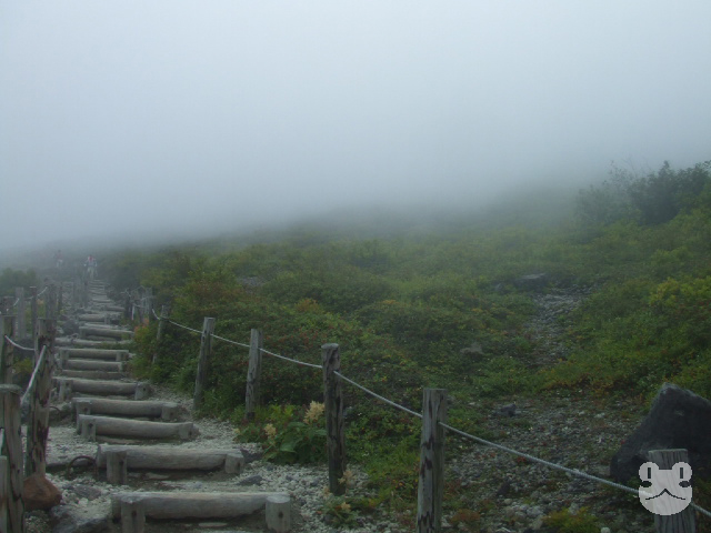 途中でガス(霧)がかかってきた。7合目では晴天だったが雲があったためか、そこまで登ってきているということかもしれないが。
