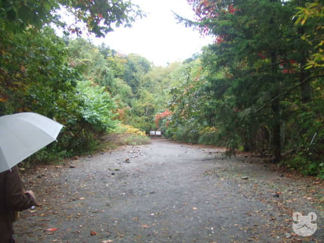 各々傘を持ち、林道の遊歩道を歩く。一本道だが、微妙に勾配があるためいい運動になる。