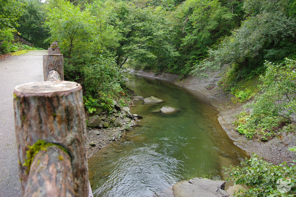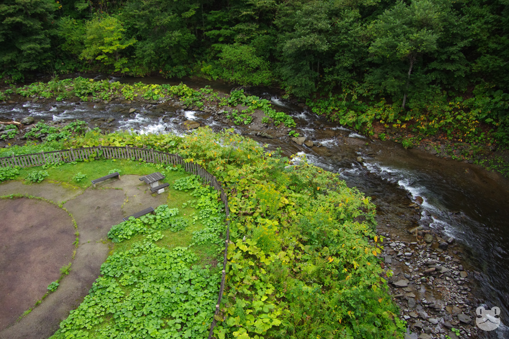 来た道を戻り、道道へ出て清水橋を渡った先、ラルマナイ郷橋の途中に半円形の展望スペースがあるのでそこから眺めてみる。